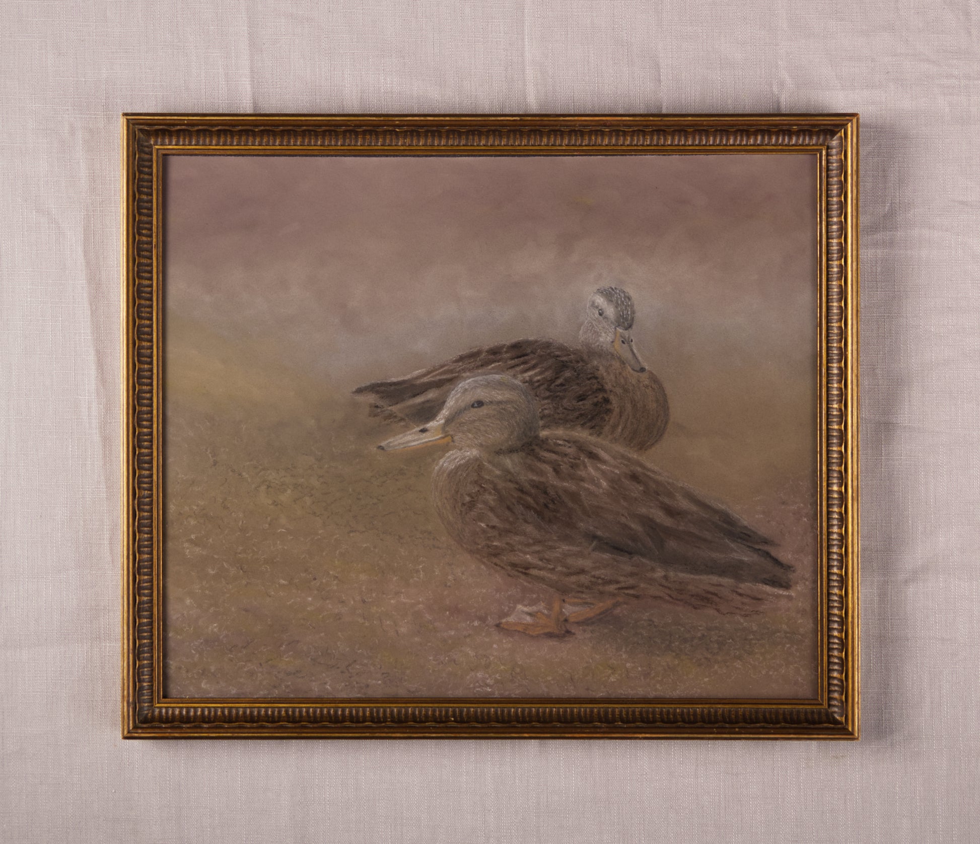 A soft, warm-toned painting of two ducks standing still on dry ground, far from the water’s edge.